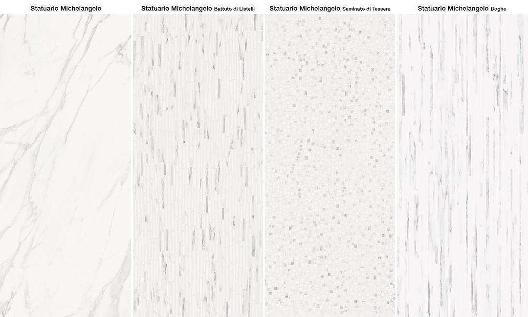 Tele Di Marmo Statuario Michaelangelo 24×48 Battuto Di Listelli Lappato Rectified